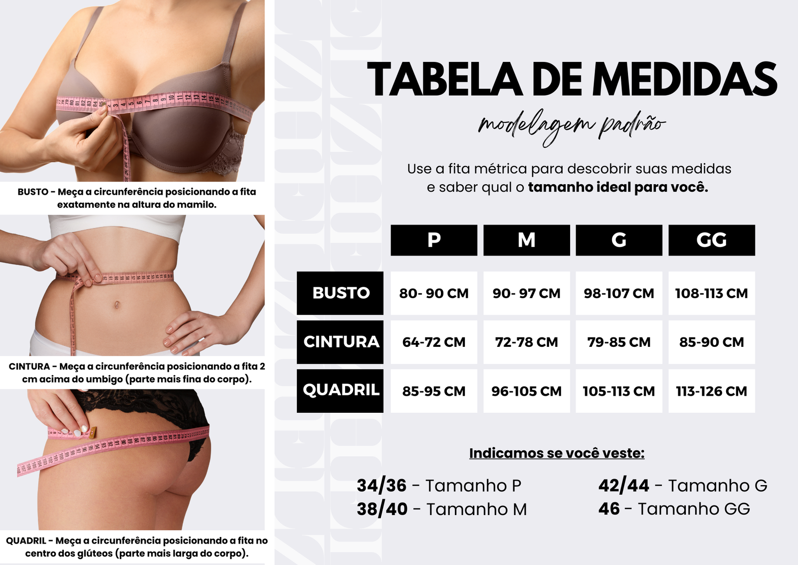 GG - Comprimento: 108CM / Quadril: 128CM / Cintura: 74CM